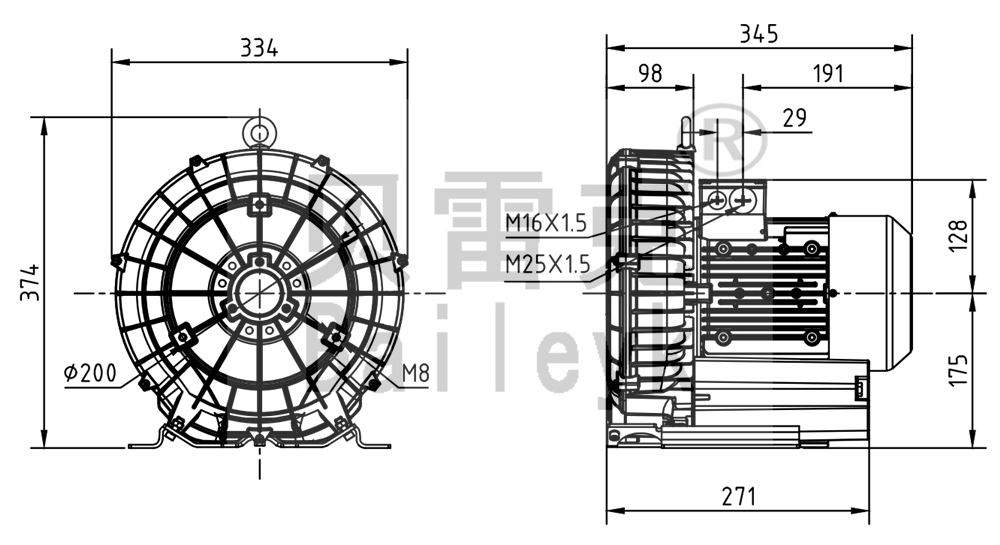 最大風量:210m3/h 最大正壓:270mbar 最大負壓:220mbar 防護等級:IP55 噪音:64db 重量:26Kg