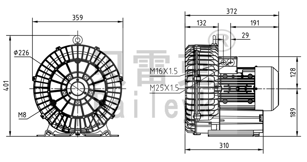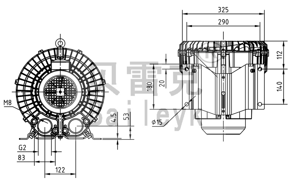 最大風(fēng)量:345m3/h 最大正壓:195mbar 最大負(fù)壓:200mbar 防護(hù)等級(jí):IP55 噪音:70db 重量:29Kg